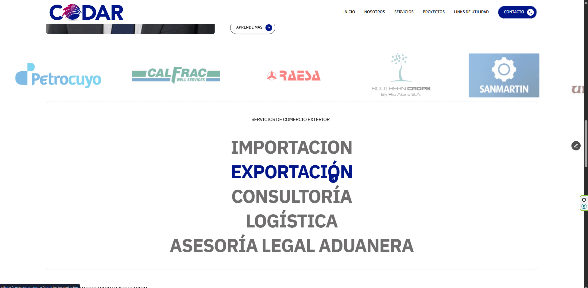 CODAR — Sitio web corporativo para empresa de Comercio Exterior. Diseñé y desarrollé una experiencia digital enfocada en claridad estratégica, posicionamiento profesional y conversión de leads, priorizando performance y estructura escalable.
